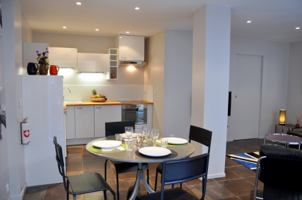 sala de estar / jantar com sofá-cama 140x190 cm para 1 pessoa, uma mesa de café, HDTV, DVD, som para iPod, uma conexão com a internet, uma mesa e quatro cadeiras.