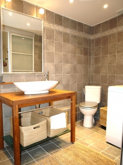 Banheiro: com pia, secador de cabelo, ferro e tábua de passar, máquina de lavar roupa e WC